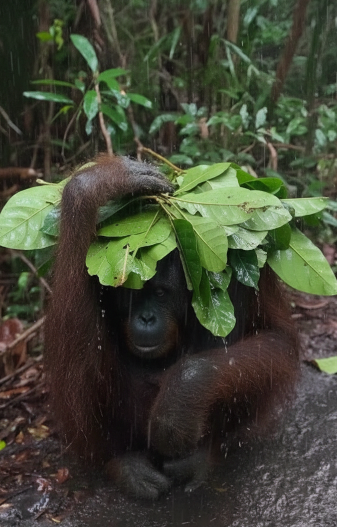 Salah satu aspek paling menarik dari orangutan adalah kemampuannya menggunakan benda di sekitarnya sebagai alat. Penggunaan dahan atau daun besar sebagai pelindung dari hujan sering dilaporkan dalam pengamatan lapangan dan dikategorikan sebagai inovasi perilaku [1]. Perilaku ini bukan refleks semata, melainkan bentuk pemecahan masalah berbasis pengalaman. Selain itu, orangutan diketahui menggunakan ranting untuk mengambil serangga atau biji dari celah sempit. Kebiasaan ini menunjukkan bahwa kecerdasan orangutan terbentuk dari interaksi langsung dengan lingkungan kompleks hutan hujan [1], [3].