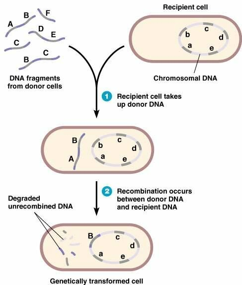 Ini dianggap sebagai metode seksual (pertukaran materi genetik). Dalam metode ini, DNA dari satu bakteri masuk secara langsung ke dalam sel bakteri lain dari spesies yang sama dan membentuk DNA rekombinan. DNA masuk melalui lingkungan ekstraseluler. Bakteri yang mampu melakukan ini disebut sel kompeten. Contoh Spesies: Streptococcus pneumoniae (bakteri percobaan Griffith), Haemophilus influenzae, dan Bacillus subtilis.
