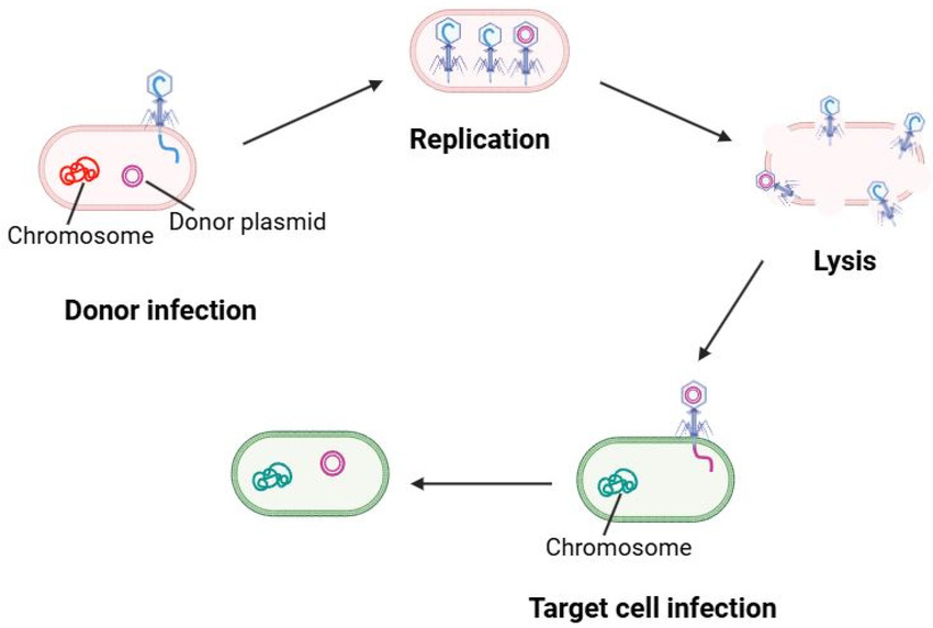 Perpindahan materi genetik dengan perantara virus bakteri (Bakteriofag). Virus yang menginfeksi bakteri donor secara tidak sengaja membawa potongan DNA bakteri tersebut dan menyuntikkannya ke bakteri baru. Contoh Spesies: Salmonella typhimurium (vektor: fag P22) dan Staphylococcus aureus.