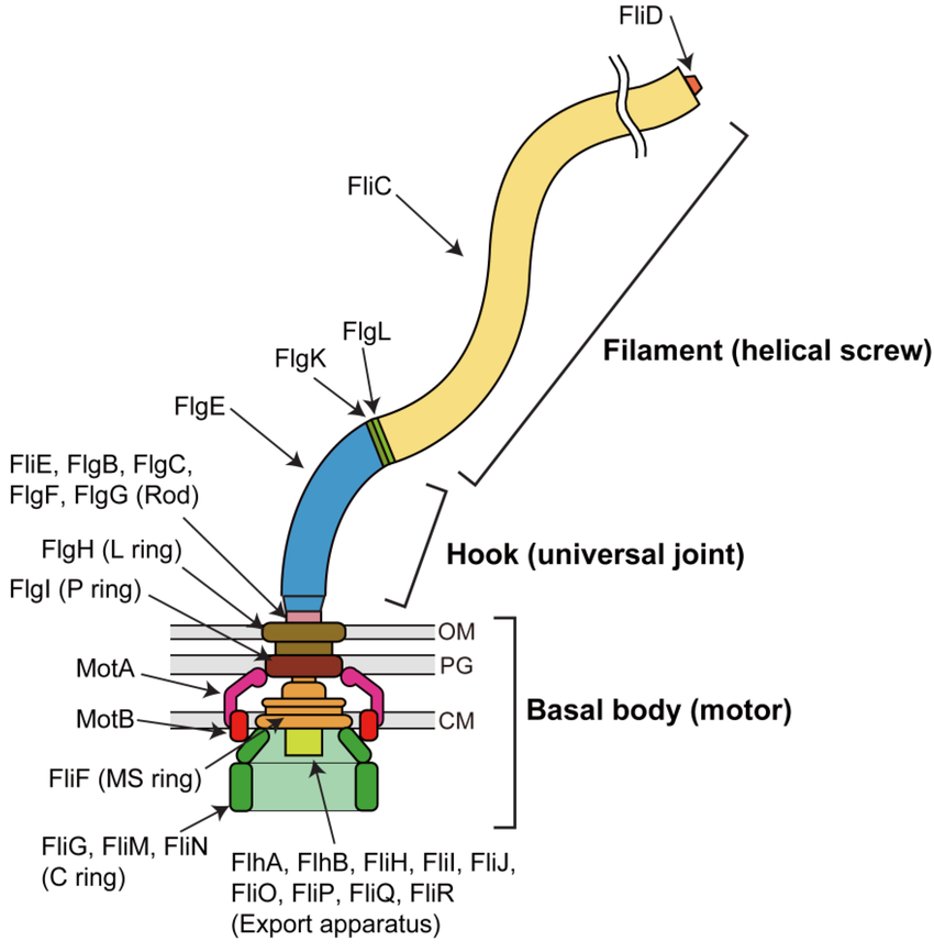 Secara anatomis, flagela tersusun atas tiga bagian yang terintegrasi: