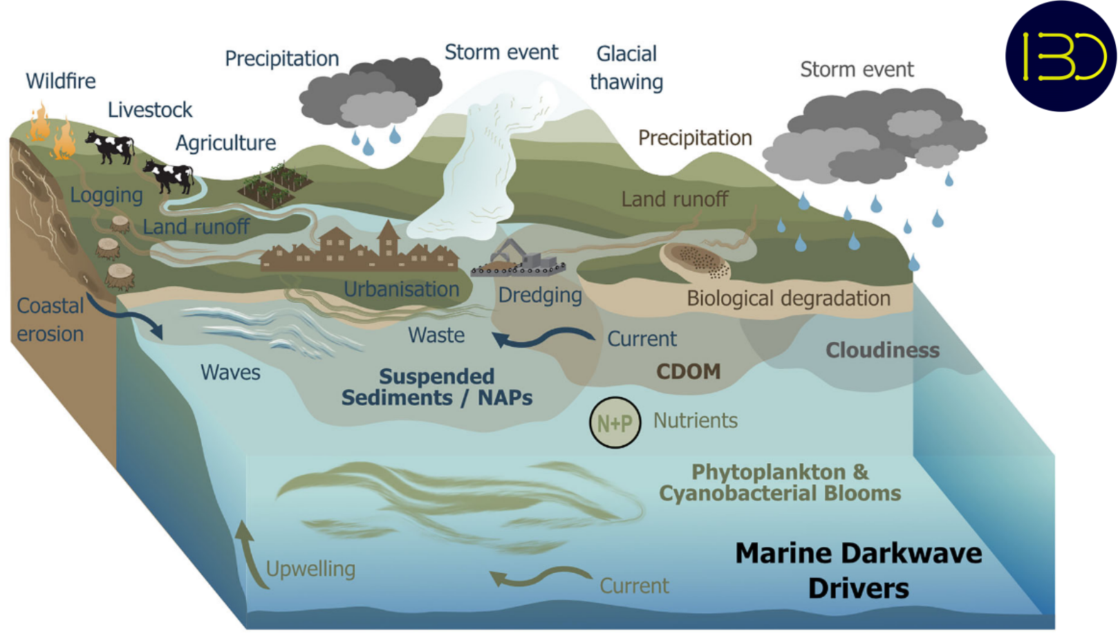 Berdasarkan analisis komprehensif yang dilakukan tim peneliti, Marine Darkwaves dipicu oleh kombinasi mematikan antara penggerak primer (primer drivers) di dalam air dan penggerak sekunder (secondary drivers) dari darat dan atmosfer. Kegelapan ini tidak muncul begitu saja. Di dalam kolom air, tiga faktor utama menjadi biang keladi yang memblokir sinar matahari :