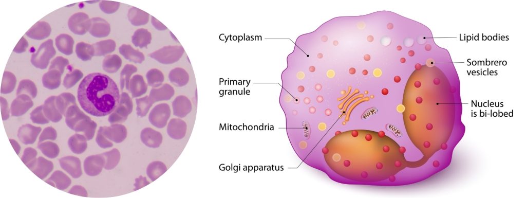 Jumlah eosinofil relatif lebih sedikit dibandingkan neutrofil, hanya menyusun 1-4% dari total leukosit. Secara ultrastruktur, granula spesifik eosinofilik terlihat berbentuk oval, dengan inti kristaloid pipih yang mengandung protein dasar utama (major basic proteins).