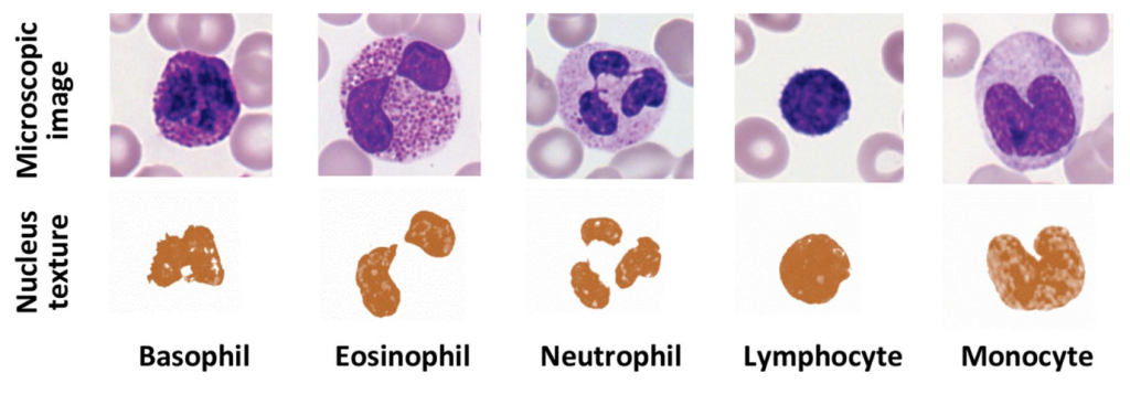 Gambar 3. Citra mikroskopis dari contoh sel darah putih (WBC) matang dan tekstur nucleus single tone yang bersesuaian, diperoleh menggunakan dekonvolusi warna (Sumber : Dinčić et al., 2021).